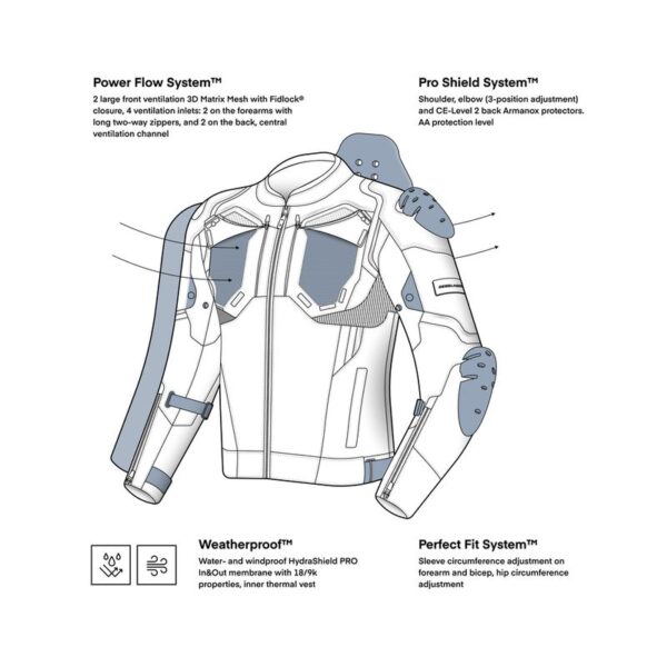 • Podloga: 100 % poliestrska mreža – zračnost in udobje – Membrana HydraShield™ PRO: Dvoslojni sistem zagotavlja prilagodljivo zaščito za različne vremenske in vozne razmere.